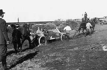 Barney Oldfield being pulled by a team of Mules from the New River north of